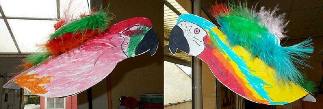 Dans un premier temps, ils ont collé des plumes de toutes les couleurs sur le dessus et le dessous des ailes. Dans un second temps, ils ont colorié l'oiseau en vert, rose, rouge, bleu et jaune. Pour terminer, j'ai assemblé chaque oiseau et je les ai accrochés dans la salle d'accueil périscolaire.