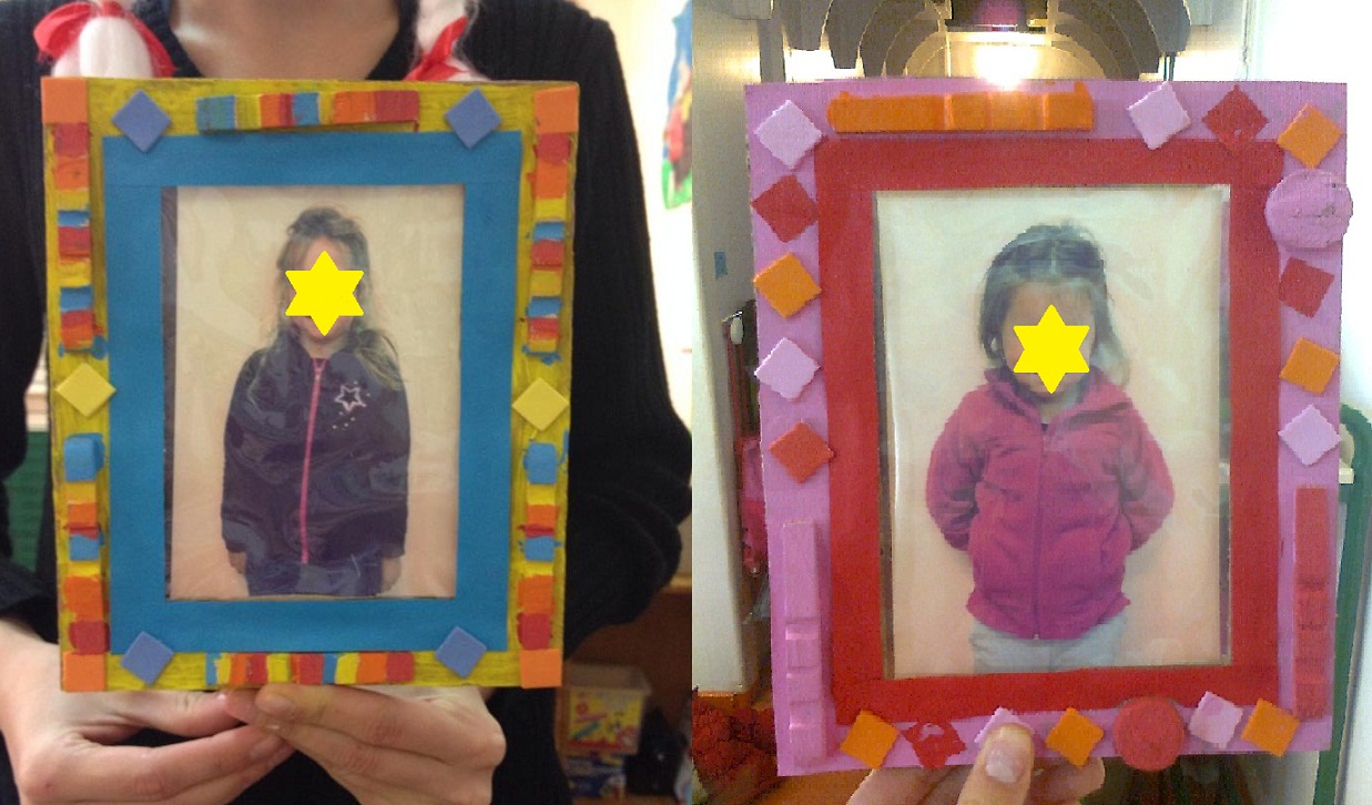 Les enfants ont peint leur cadre de la couleur qu'ils voulaient. Puis, l'ont décoré en collant des rondelles de bouchon, des moitiés de pinces à linge et des carrés en mousse. Pour cacher les agrafes, j'ai collé des bandelettes de papier couleur autour de la photo.